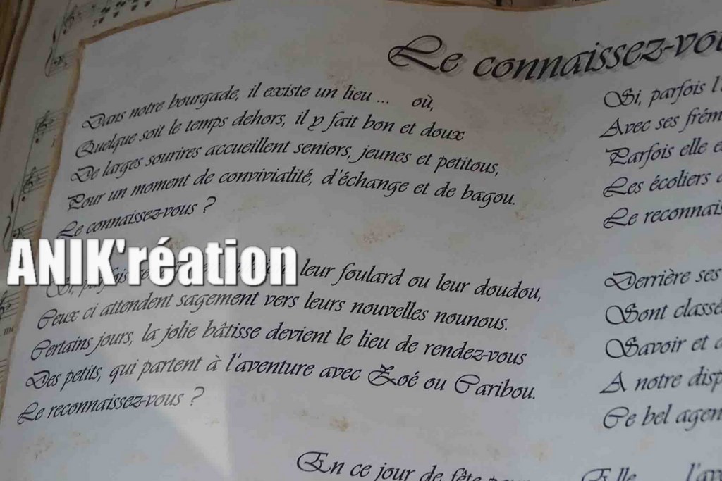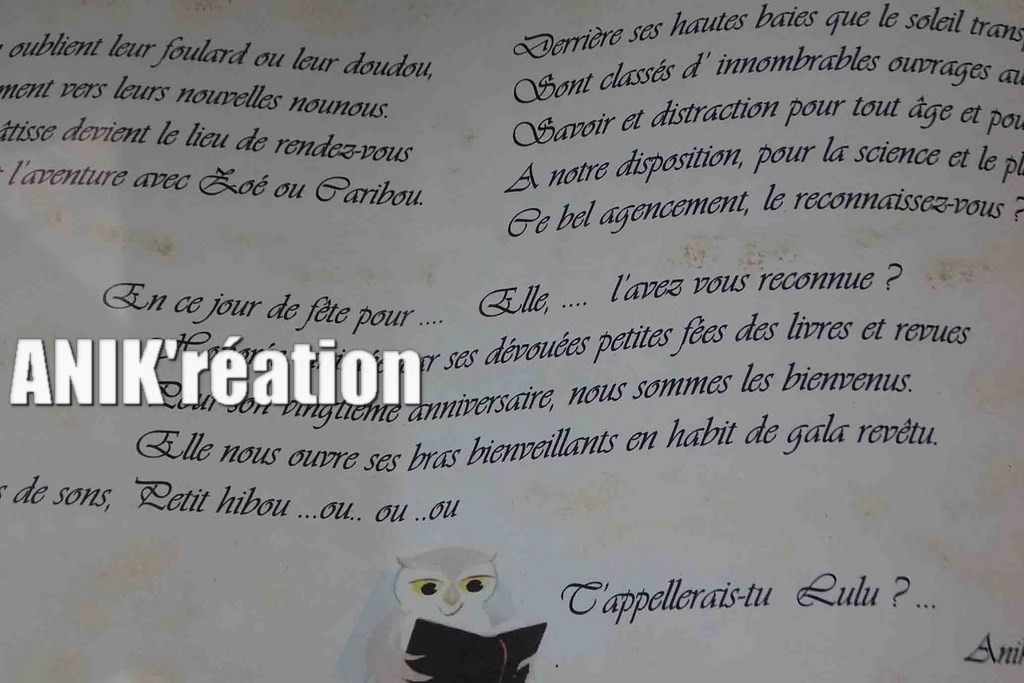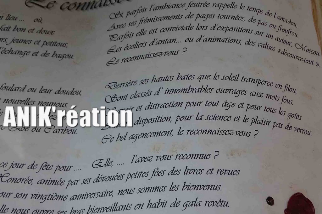 photo : Poème écrit pour les 20 ans de la bibliothèque de Pierre de Bresse, rimes en OU, clin d'oeil au carton d'invitation de cette manifestation. support livre ouvert sur bois ( gnoëlib couché )