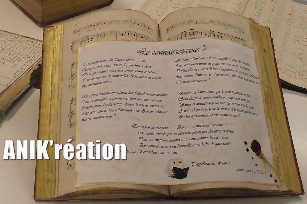 photo : Poème écrit pour les 20 ans de la bibliothèque de Pierre de Bresse, rimes en OU, clin d'oeil au carton d'invitation de cette manifestation. support livre ouvert sur bois ( gnoëlib couché )